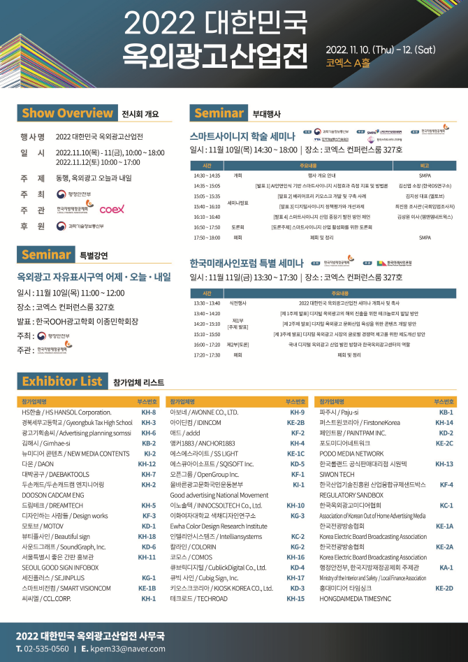 아울러, 11월10일부터 11월11일까지는 옥외광고 관련 학계에서 옥외광고 산업발전 방향을 모색하고 제시하는 학술 세미나, 강연 등이 진행된다.