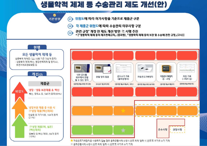 생물학적 제제 등 수송관리 제도 개선의 주요 내용은 ▲생물학적 제제 등을 보관온도 등에 따라 3개의 제품군으로 구분 ▲제품군별 수송 시 온도관리 의무사항 구분 적용이다.